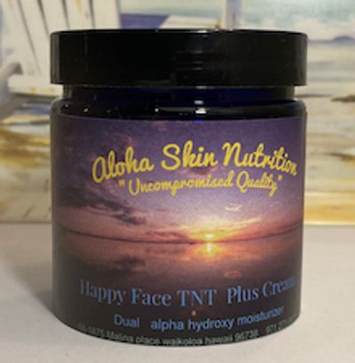 Aloha Skin Nutrition, Happy Face TNT Plus cream has the ability to gradually dissolve, roughed photo-aged cross-linked skin tissues, with continued application. Due to the nature of the skin supplementation with Happy Face TNT plus cream application should be individualized for certain skin types in general skin reactivity. Lighter skin individuals should start treatment twice weekly at bedtime with a very scant application for approximately 2 weeks. Then gradually increase the frequency as tolerated. This product should not be applied to the eye area. Discontinue use if significant irritation is encountered. After using this product for months, compliments on your skin will become more frequent.
